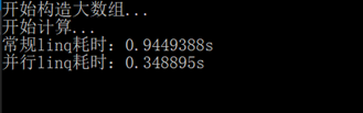 28 Console.WriteLine("并行linq耗时:{0}s", dt2.TotalSeconds.ToString());