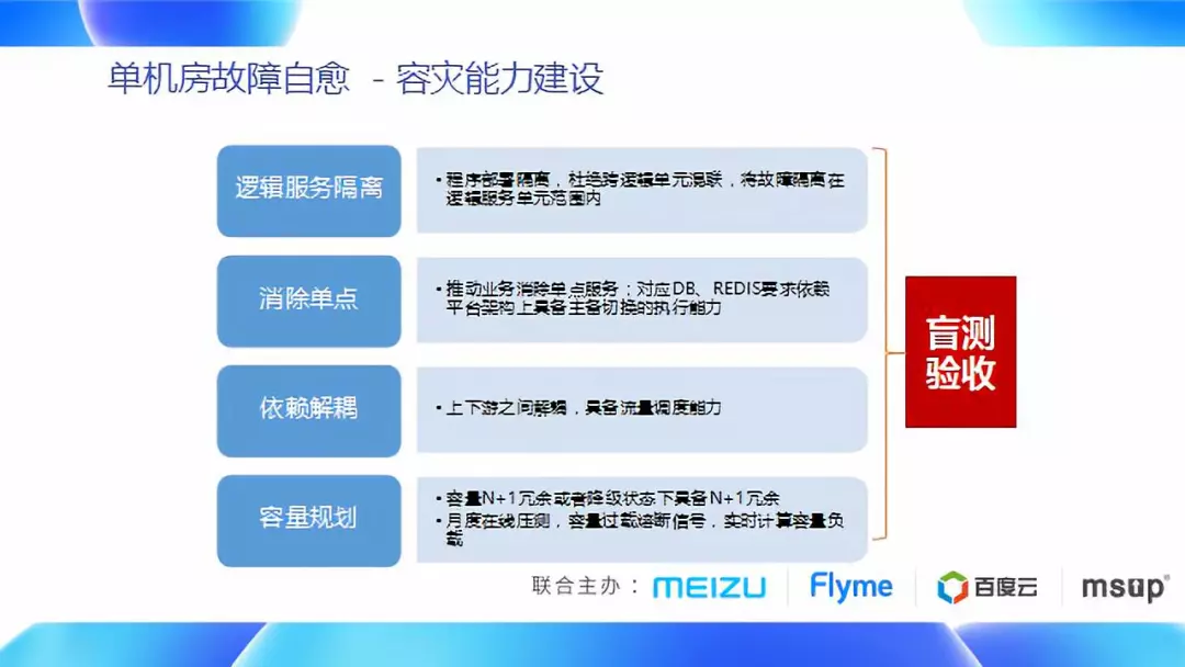 最后讲一下盲测验收。有了故障自愈的系统后,怎么证明你的方案好用呢?在不通知业务的情况下,我们会和IDC同事进行配合,拔网线或是制造网络拥塞,这时候才能进行完整的切换,从而可以证明基础能力是否达标。
