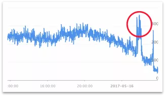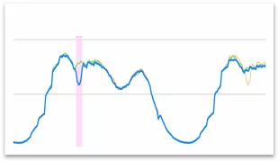 上图中的蓝、绿、黄三条线分别代表着今天、昨天、上周的时间线,蓝线比较明显,后面还有绿线和黄线。它们相对来说周期性体现得特别强。这种数据很难用传统的计算方法设置阈值。针对这种场景,我们会使用不同类的算法,专门解决这种问题。