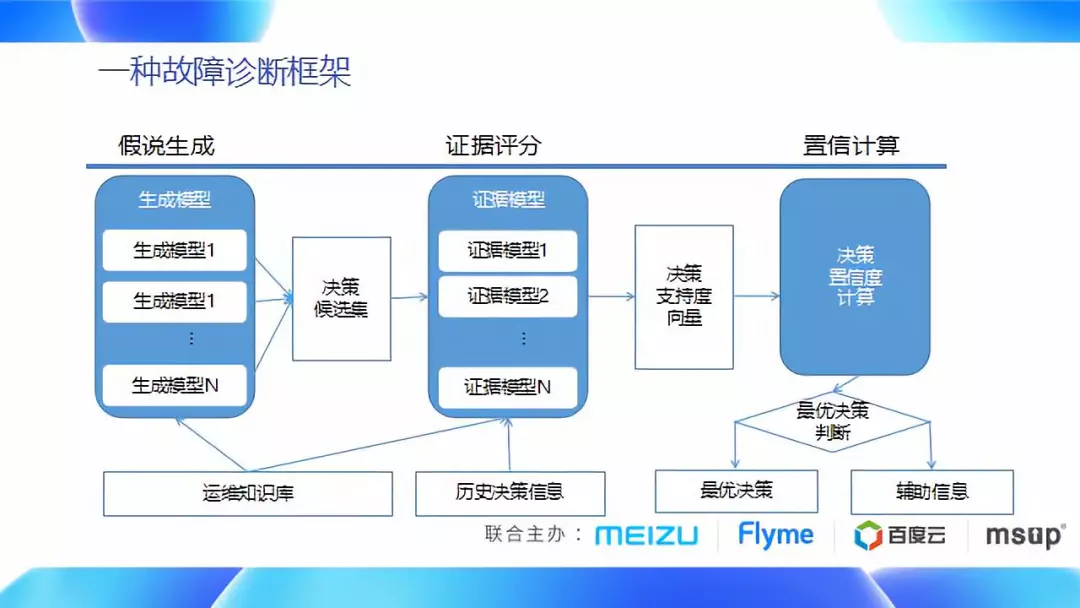 上图是一类典型的故障诊断框架。我们可能有很多故障的分类,比如有网络故障,细分一点是有交换机故障、链路故障,可能有系统故障,业务问题、操作问题等各种各样的,都是属于假说生成,可能都是备选故障问题。中间有一个证据评分,相当于基于前面的模型拓扑关系,对不同的故障做评分,把拓扑关系的线做权重,然后做置信计算和排序,最后给出最优决策判断。