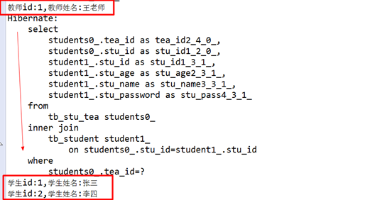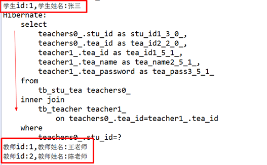 List<Teacher> teachers = student.getTeachers(); for (Teacher teacher : teachers) { System.out.println("教师id:"+teacher.getTeaId()+",教师姓名:"+teacher.getTeaName()); } //2、关闭资源 manager.close(); } |