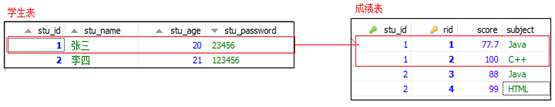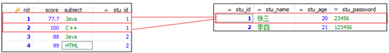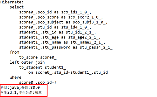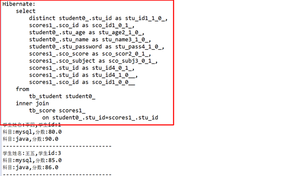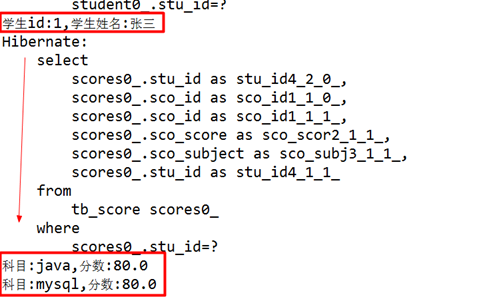 List<Score> scores = student.getScores(); for (Score score : scores) { System.out.println("科目:"+score.getScoSubject()+",分数:"+score.getScoScore()); } System.out.println("---------------------------------"); } } |