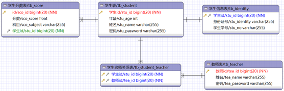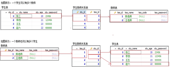 | // 学生表和教师表是多对多的关系 // 所以,一个学生可以有多个教师,所以需要使用集合来存储教师信息 //1.声明关系,多对多 @ManyToMany //2.设置关联的条件 //JoinTable用于对应中间表的设置 joinColumns设置中间表与本表关联的外键 inverseJoinColumns设置中间表与关联表对应的外键 @JoinTable(name="tb_stu_tea" ,joinColumns=@JoinColumn(name="stu_id"),inverseJoinColumns=@JoinColumn(name="tea_id")) private List<Teacher> teachers;