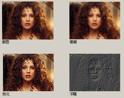 浮雕效果与锐化的方法相似,稍不同的是矩阵中的权值相加为0,比如把上面矩阵中间的5改成4,用该像素与周围像素的差值代替该像素: