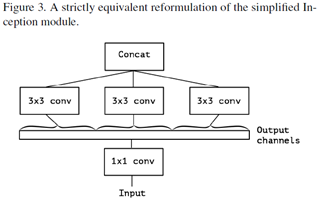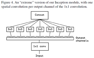 Inception module有不同的形式,考虑Inception V3中的典型的形式如图1,去掉avgpooling后,可简化为图2的形式。简化形式完全等价于图3的形式, 图3的一个极端形式(extreme inception, i.e. Xception)如图4所示。值得注意的是,图4几乎与depthwise separable conv identical。差别在于: