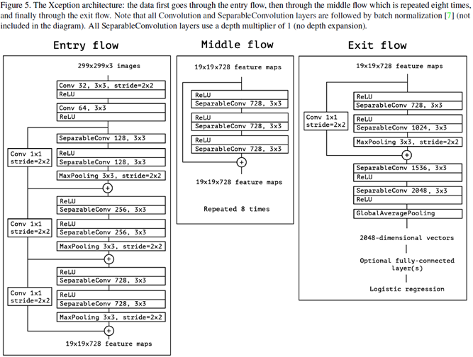 一言以蔽之,一个用depthwise separable conv堆砌的,加了residual connection的architecture. 如图5所示。coding: https://github.com/kwotsin/TensorFlow-Xception