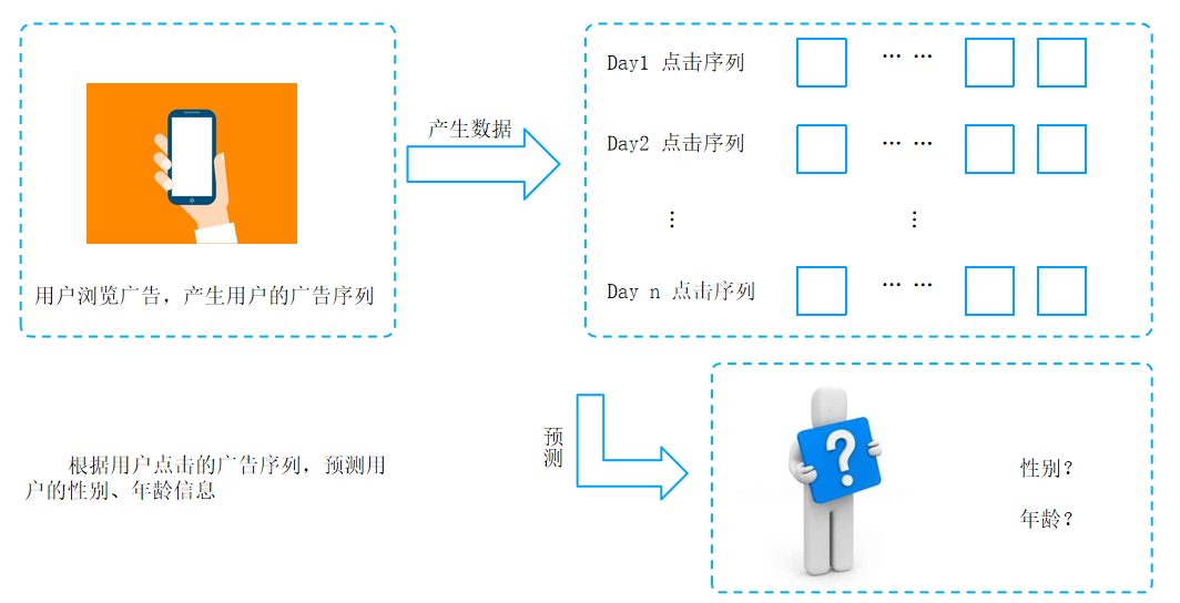 本届算法大赛的题目来源于一个重要且有趣的问题。众所周知,像用户年龄和性别这样的人口统计学特征是各类推荐系统的重要输入特征,其中自然也包括了广告平台。这背后的假设是,用户对广告的偏好会随着其年龄和性别的不同而有所区别。许多行业的实践者已经多次验证了这一假设。然而,大多数验证所采用的方式都是以人口统计学属性作为输入来产生推荐结果,然后离线或者在线地对比用与不用这些输入的情况下的推荐性能。本届大赛的题目尝试从另一个方向来验证这个假设,即以用户在广告系统中的交互行为作为输入来预测用户的人口统计学属性。