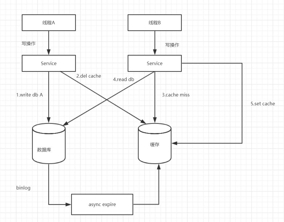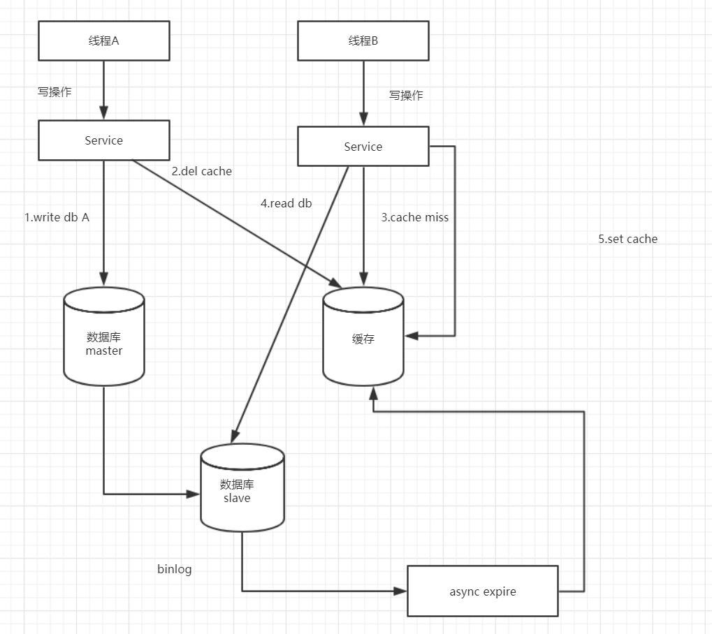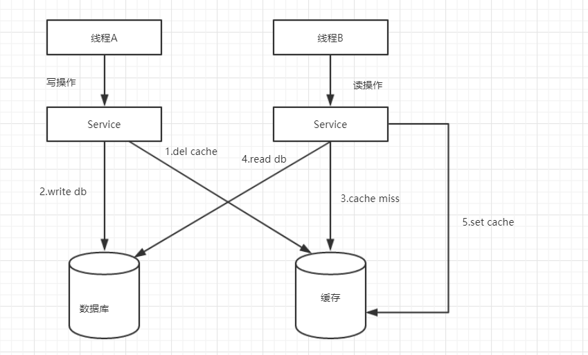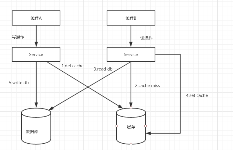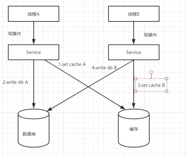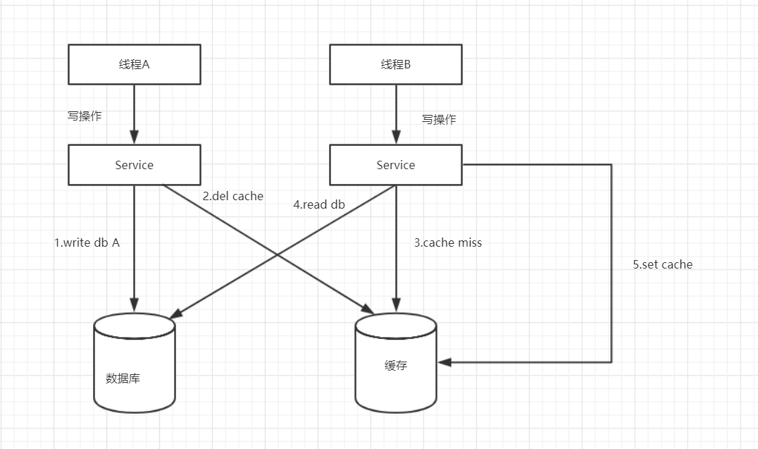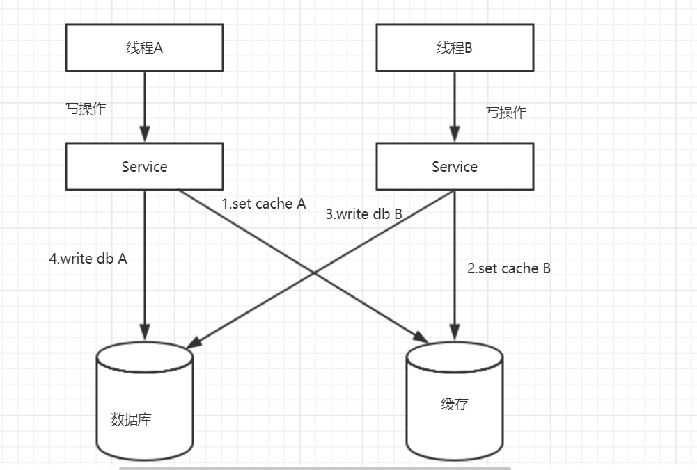 一写(线程A)一读(线程B)操作,先操作数据库,再操作缓存。