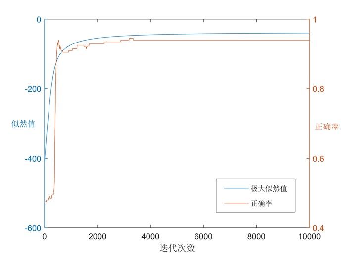 可以看到随着迭代数的增加,对原数据的分类准确率越来越高。对迭代过程进行可视化,我们可以看到似然函数随着参数改变的迭代优化过程: