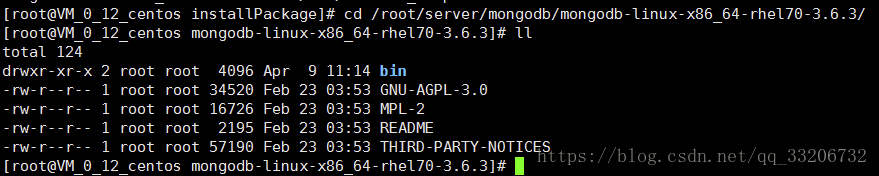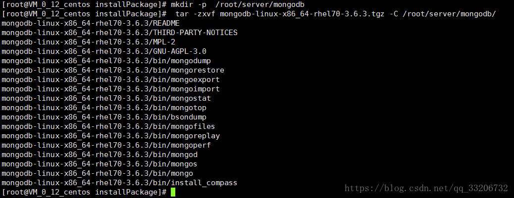 上图中,我先使用mkdir -p /root/server/mongodb在root目录下创建server目录以及其子目录mongodb,然后使用tar -zxvf mongodb-linux-x86_64-rhel70-3.6.3.tgz -C /root/server/mongodb/命令将压缩包解压缩到mongodb目录下。