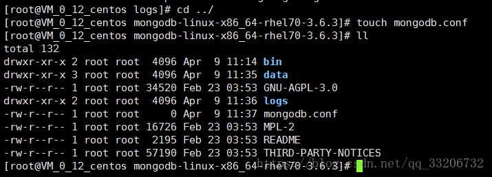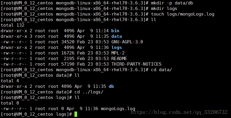 与windows系统一样,我们需要先在bin的同级创建data目录及其子目录db,以及日志目录logs以及其日志文件mongoLogs.log,如图: