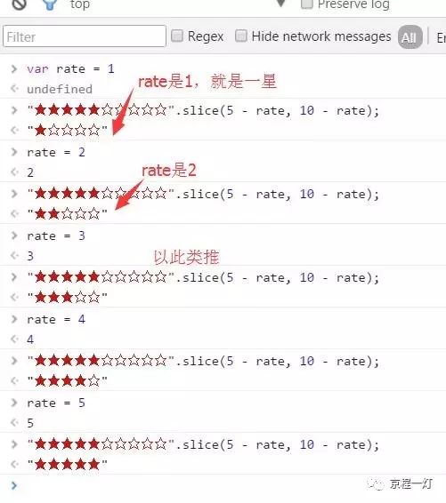 "★★★★★☆☆☆☆☆".slice(5 - rate, 10 - rate);定义一个变量rate是1到5的值,然后执行上面代码,看图