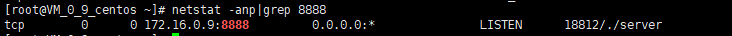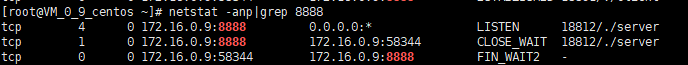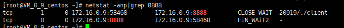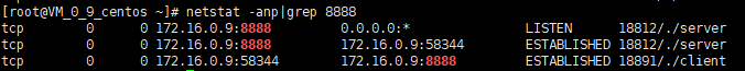 这里注意,我们发现多了两行记录,第二行代表的是服务器本地已经连接到客户端,并且监听的客户端端口是58344,第三行代表的是本地客户端端口是58344,连接的是远端ip为172.16.0.9,端口为8888的服务器。既然新增的两个状态都是ESTABLISHED说明双方三次握手已经建立并正在通信。