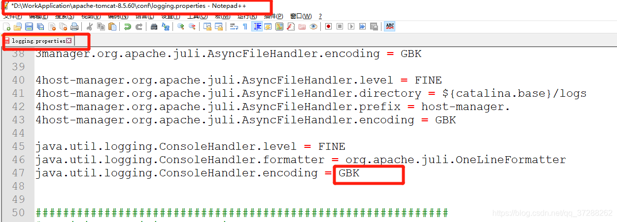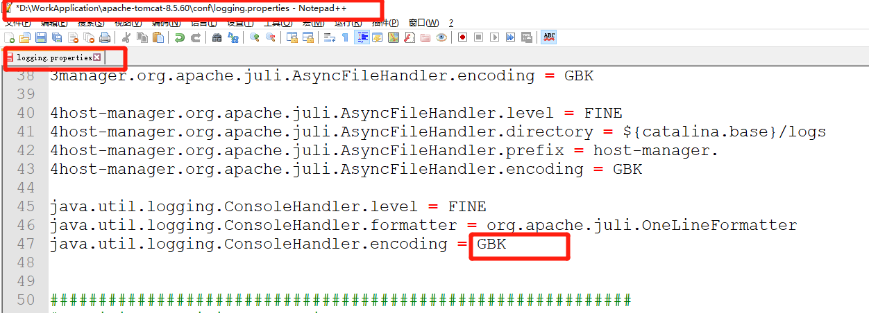 把Tomcat下日志输出编码改为GBK编码。找到Tomcat安装目录下的conf目录中的logging.properties配置文件。