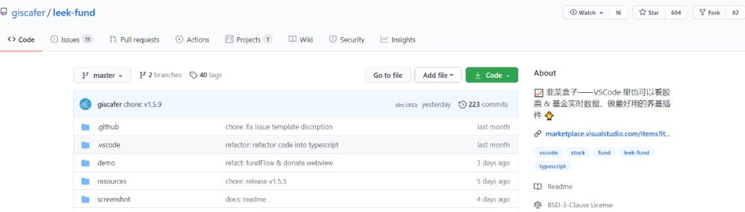 目前,leek-fund在Github上标星604,累计分支 82 个(Github地址:https://github.com/giscafer/leek-fund)