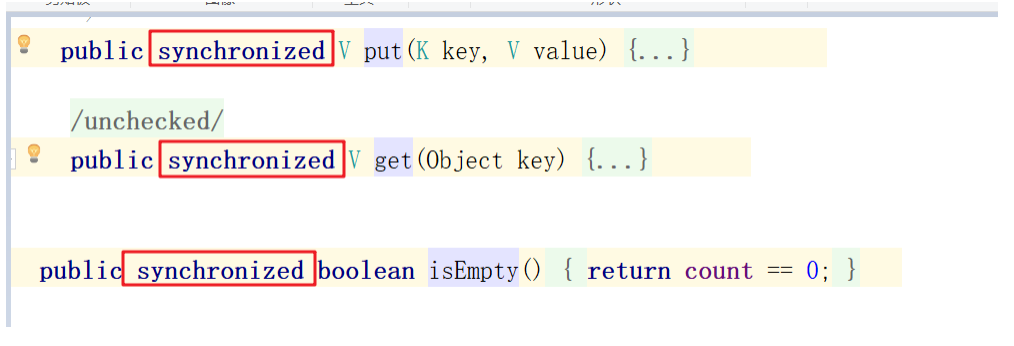 我们知道第一代并发集合的代表:Vector、Hashtable。它们是通过结合synchronized关键字实现线程安全,特点是并发性能不高。