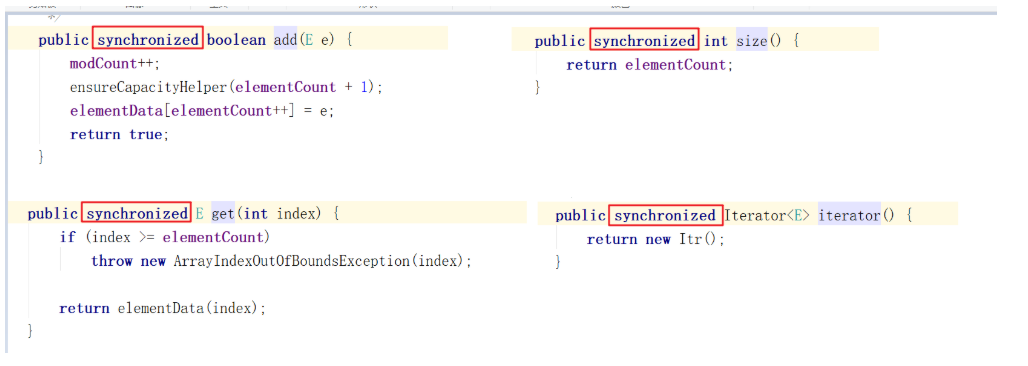 知道了ArrayList的底层实现原理,我们也就知道了Vector的底层实现原理,原因是ArrayList与Vector是同类。它们唯一的区别是:ArrayList线程不安全,Vector线程安全。这样一来问题就简单了,我们只需要搞清楚Vector是如何实现线程安全即可。我把平常开发中,你熟悉的方法:add、get、size、iterator。截图放在一起,你一看就明白了: