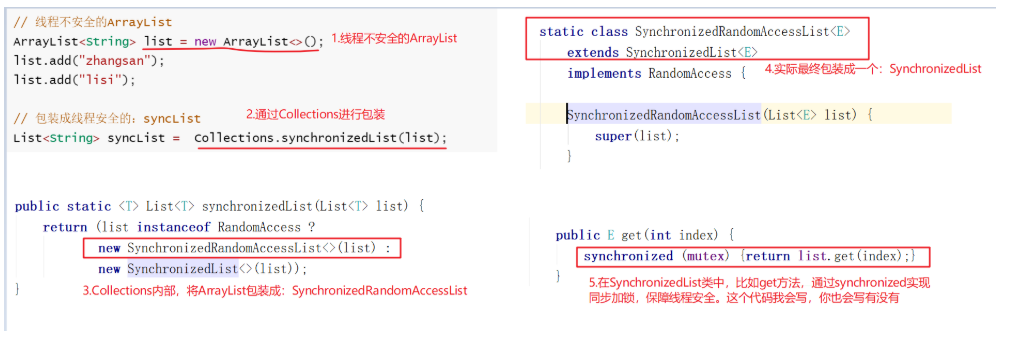 通过截图,你已经知道了通过Collections工具类,可以把线程不安全的集合,包装成线程安全的集合,并且它的本质不变,还是通过我们熟悉的synchronized关键字。