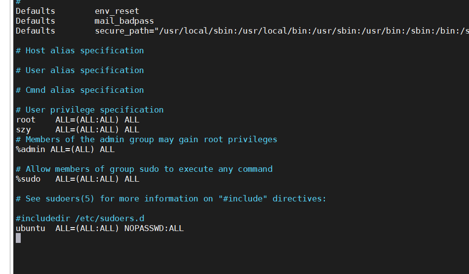 ALL=(ALL:ALL) ALL 的意思就是被授权的用户,在所有的主机、获取所有用户|用户组的身份、使用所有的sudo命令。