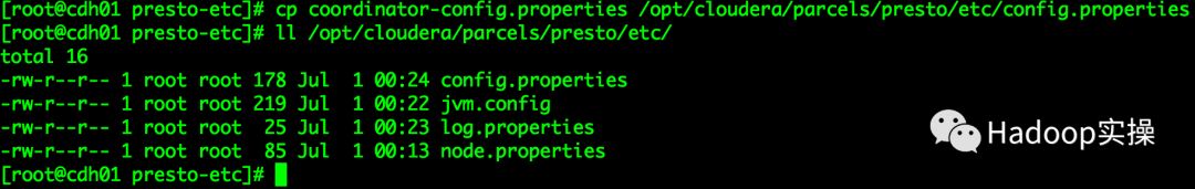 [root@cdh01 presto-etc]# cp coordinator-config.properties /opt/cloudera/parcels/presto/etc/config.properties