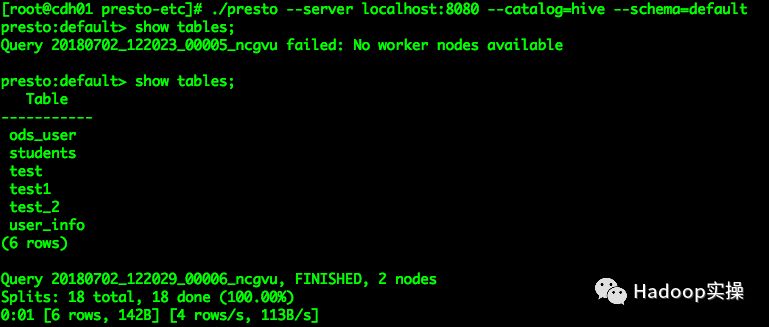 [root@cdh01 presto-etc]# ./presto --server localhost:8080 --catalog=hive --schema=default