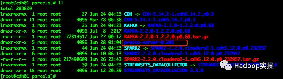 [root@cdh01 presto]# tar -zxvf presto-server-0.205.tar.gz -C /opt/cloudera/parcels/