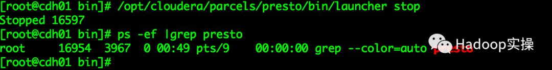 [root@cdh01 bin]# /opt/cloudera/parcels/presto/bin/launcher stop