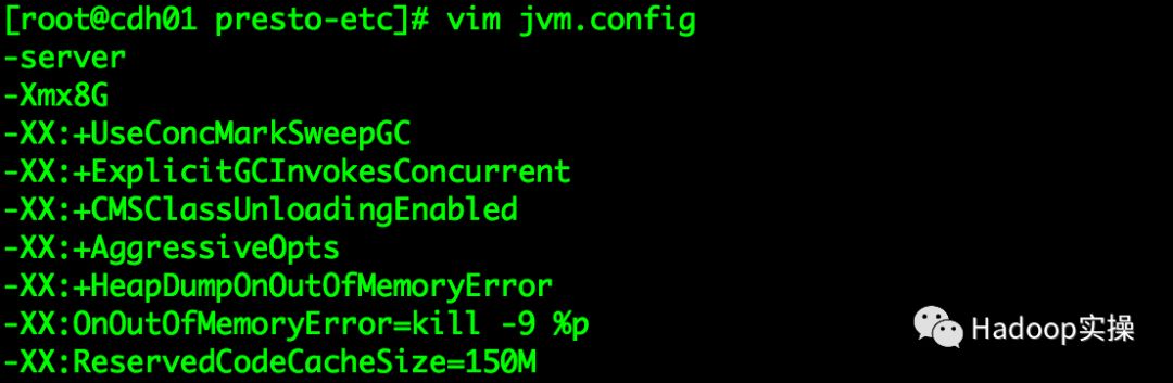 2.配置Presto的JVM参数,创建jvm.config文件,内容如下: