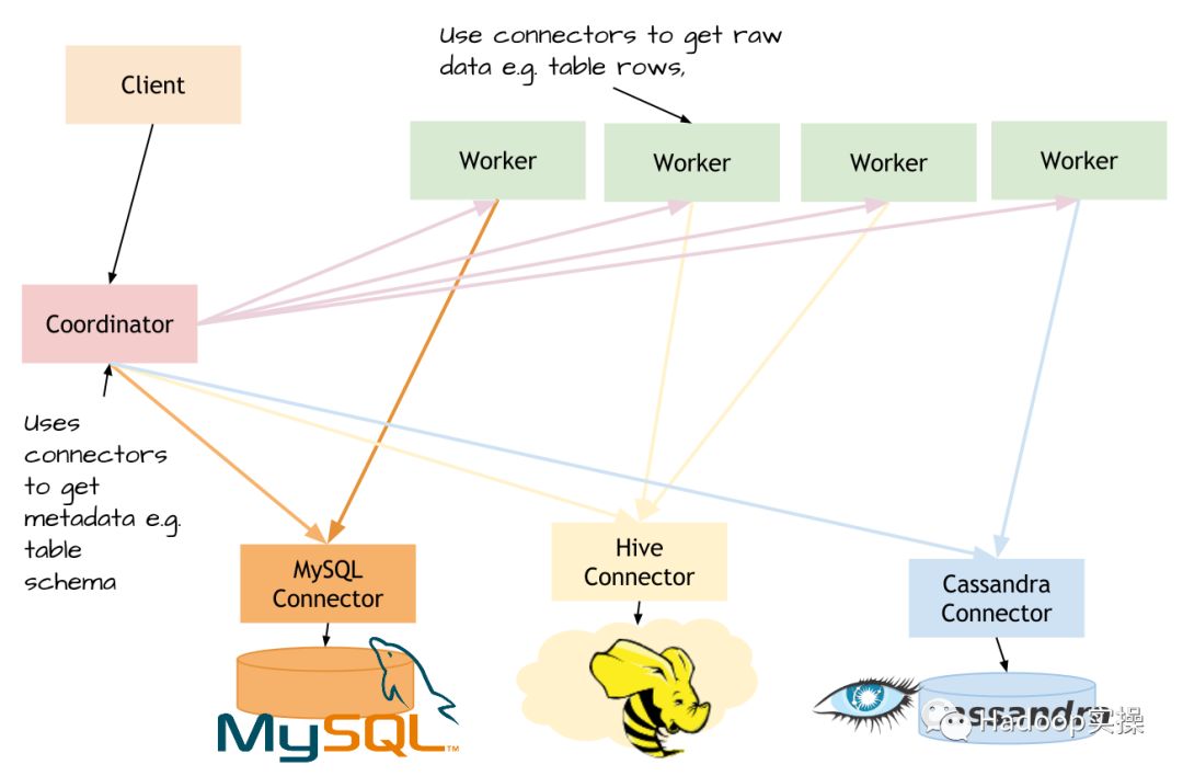 Presto是一个运行在多台服务器上的分布式系统。 完整安装包括一个coordinator和多个worker。 由客户端提交查询,从Presto命令行CLI提交到coordinator。 coordinator进行解析,分析并执行查询计划,然后分发处理队列到worker。