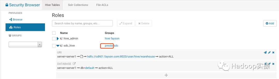 2.集群启用了Sentry,这里我们使用presto用户访问Hive所以为presto用户授权default库的所有权限