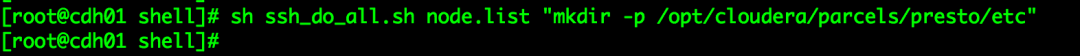 [root@cdh01 shell]# sh ssh_do_all.sh node.list "mkdir -p /opt/cloudera/parcels/presto/etc"