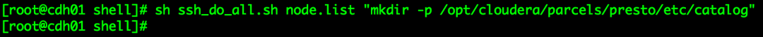 [root@cdh01 shell]# sh ssh_do_all.sh node.list "mkdir -p /opt/cloudera/parcels/presto/etc/catalog"