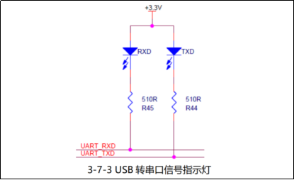 同时对串口信号设置了 2 个 PCB 上丝印为 TXD 和 RXD 的 LED 指示灯, TXD 和RXD LED 灯会指示串口是否有数据发出或者是否有数据接受,如下图所示