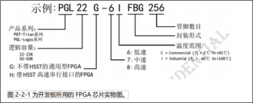 前面已经介绍过了,我们所使用的 FPGA 型号为 PGL22G6CMBG324,属于紫光同创公司的 Logos 系列产品,速度等级为-6,温度等级为商业级 C。此型号为 MBG324 封装,324 个引脚。Logos 系列 FPGA 命名规则如图所示。
