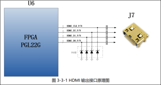 HDMI 输出接口的实现,是通过 FPGA 的 4 路 LVDS 差分信号(3 路数据和一路时钟)接口直接驱动 HDMI 输出,为开发板提供不同格式的视频输出接口。其中,HDMI 接口和 FPGA 之间的 LVDS 差分信号的连接使用 AC Couple 的模式,起到隔直的左右。另外在硬件设计上,每对 LVDS 差分信号上增加了TVS 保护管,防止外面静电对 FPGA 的损坏。HDMI 输出接口的硬件连接如图 3-3-1 所示。