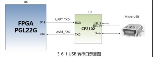 PGL22G 开发板包含了 Silicon Labs CP2102GM 的 USB-UAR 芯片, USB 接口采用 MINI USB 接口,可以用一根 USB 线将它连接到上 PC 的 USB 口进行串口数据通信 。USB Uart 电路设计的示意图如下图所示