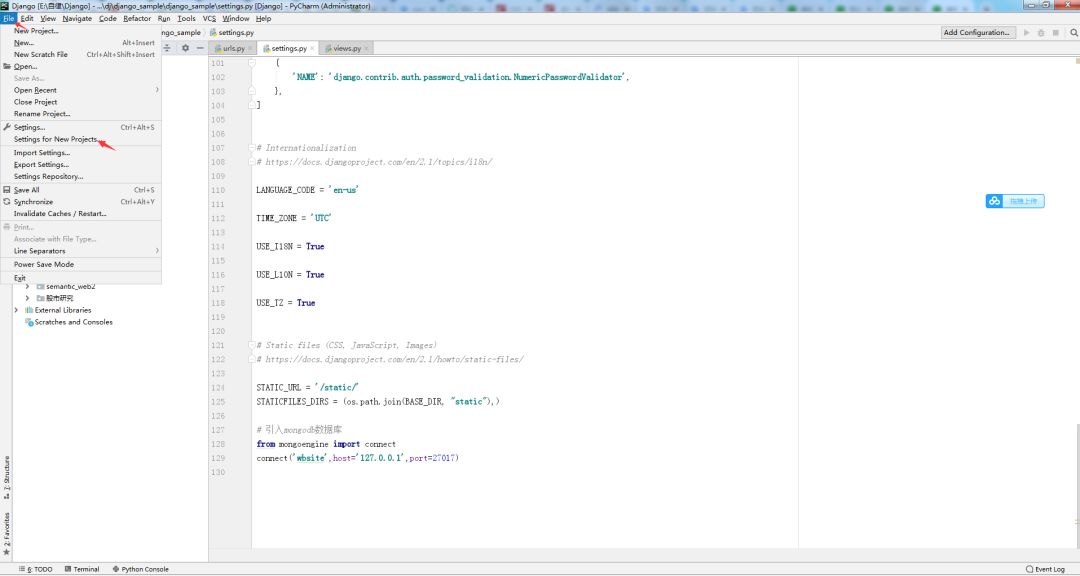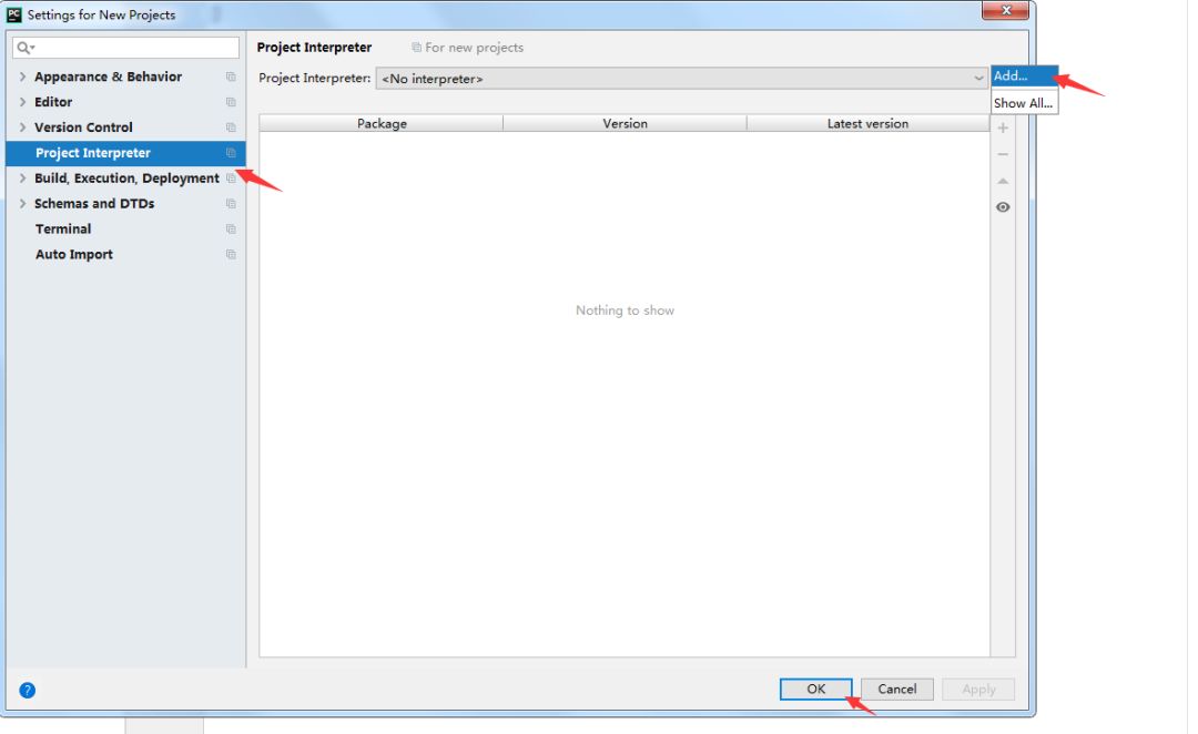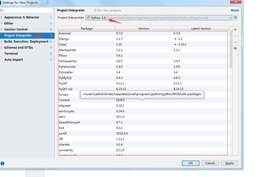 添加:在pycharm中找到project Interpreter,我装的这个版本是在file—settings for new projects。如图: