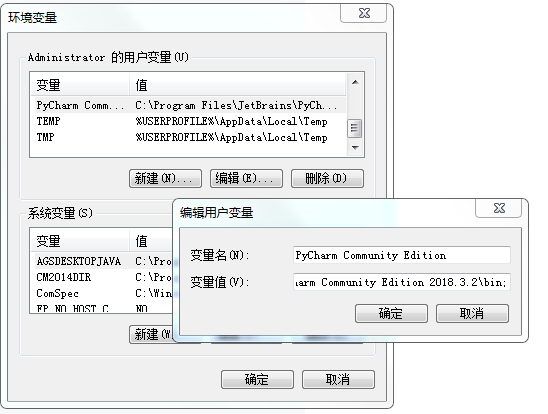 第一步:拿%PyCharm Community Edition%;举例,在环境变量有新建,变量名中填入PyCharm Community Edition;变量值中填入C:\Program Files\JetBrains\PyCharm Community Edition 2018.3.2\bin;(这个是我的pycharm的安装目录)。
