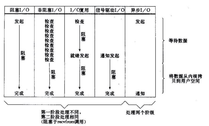 所有的系统I/O都分为两个阶段:等待就绪和操作。举例来说,读函数,分为等待系统可读和真正的读;同理,写函数分为等待网卡可以写和真正的写。