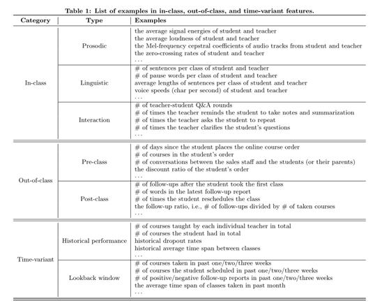 在线K12平台在记录学生上课过程的同时,在后台也会记录许多关于学生在课外过程中在平台上的各类活动,其中包括:学生在正式上课前咨询课程的记录、学生在课后与顾问老师交流的记录等;从这些记录中,我们共挖掘约40维相关特征,覆盖学生售前的沟通次数、学生在平台购买课程的体量等等,具体关于这些特征的详细信息我们已展示在后续表格中;