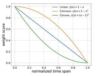 首先我们选定一个 作为扩展区间,我们将样本的正例扩展到 至 的区间;同时出于对于一般学生的退课影响近期性假设(Recency Effect),即我们认为越接近学生的退课点,学生的退课确定性越强。因此,为了强调这些接近退课时间点的样本的重要性,我们除了对正样本进行扩展还对这些扩展样本进行非平均重采样,即每个样本在重采样过程中出现的概率与其距离学生退课时间点的距离成反比:离退课时间点越近其对应重采样概率越高。在我们的实验中,我们尝试了3种不同的函数对该反比函数进行模拟: