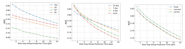 我们分别从3个方面对模型的性能进行了分析:从图1看出我们提出的模型在1~14天的预测任务上与其他模型相比都能有更优结果;从图2看出我们的数据增强方法与不使用数据增强相比为模型带来了明显的提升,除此以外当我们将正例扩展区间定为7天时,其提升效果在1~14天的整体预测结果上最为明显;从图3我们可以看出,与linear与concave函数相比convex函数对应的数据增强方法对模型的提升更大;在下面的表格中,我们展示了不同特征对模型的性能的影响,从结果可以看出3个方面的特征都对模型有正面的作用,同时课外类特征>动态类特征>课内类特征;