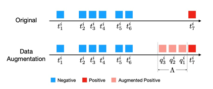 在传统方法中,针对学生退课研究的数据的打标方法主要根据退费时间进行标记,即只标记退费学生的退费当天作为正样本(Positive),剩余的所有的样本被标记为负样本(Negative);但是使用这种标注方法会使数据产生样本不平衡(data imbalance)的问题,同时由于只使用退课学生退费当天的样本作为正样本,会使模型缺失我们想要的预知性特点,即只能检测退费当天的学生。为了解决上述问题,我们提出了一种基于重采样(over sampling)改进的数据增强方法,具体做法如下图所示。