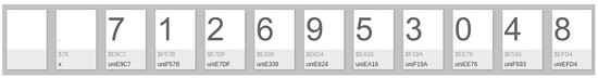 该字体文件中共有 12 个字体块,其中包括 2 个空白字体块和 0 ~ 9 的数字字体块。我们可以大胆地猜测,评分数据和票房数据中使用的数字正是从此而来。