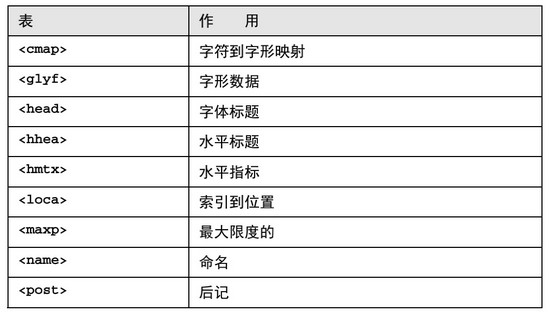 字体文件中不仅包含字形数据和点信息,还包括字符到字形映射、字体标题、命名和水平指标等,这些信息存在对应的表中,所以我们也可以认为 TrueType 字体文件由一系列的表组成,其中常用的表