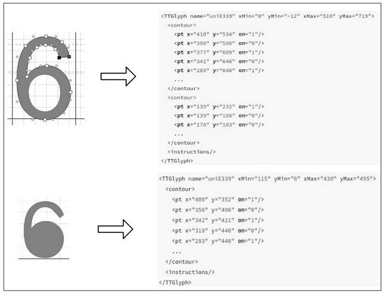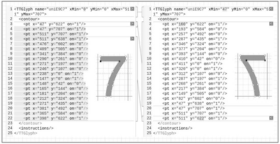 如图 6-43 所示,两个不同文字的字形数据是不一样的。虽然这两种字形的 name 都是 uniE9C7,但是字形数据中大部分 pt 标签 x 和 y 的差距都很大,所以我们可以判定这两个字形描述的并不是