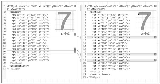 虽然点的数量不一样,但是它们的字形并没有太大的变化,也不会造成用户误读,所以点的数量并不能作为排除不同字形的条件。因此,只有起止坐标和点坐标数据完全相同的字形,描述的才是相同字符。