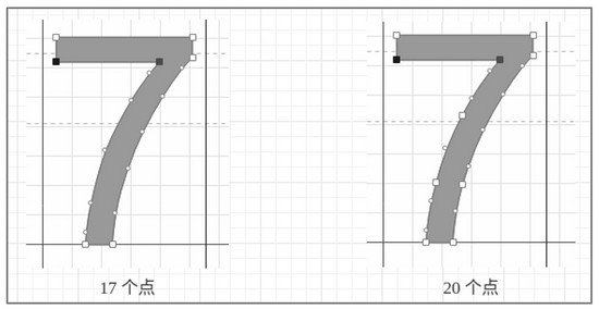 在图 6-44 中,左侧描述文字 7 的字形有 17 个点,而右侧描述文字 7 的字形却有 20 个点。对应的字形信息如图 6-45 所示。