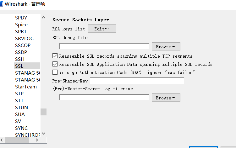 证书有了 我们就可以查看了 打开Wireshark 编辑--首选项--Protocols--SSL,点击右边的Edit: