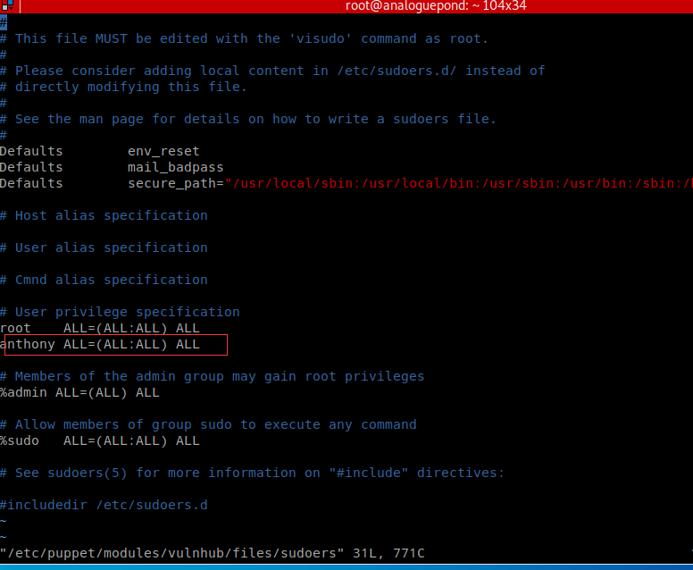 然后修改/etc/puppet/modules/vulnhub/files/sudoers,文件
